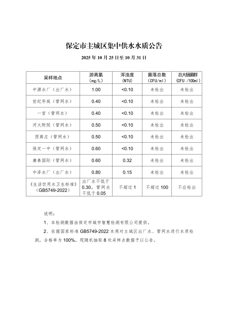 主城區(qū)集中供水水質(zhì)公告(10月25日至10月31日)