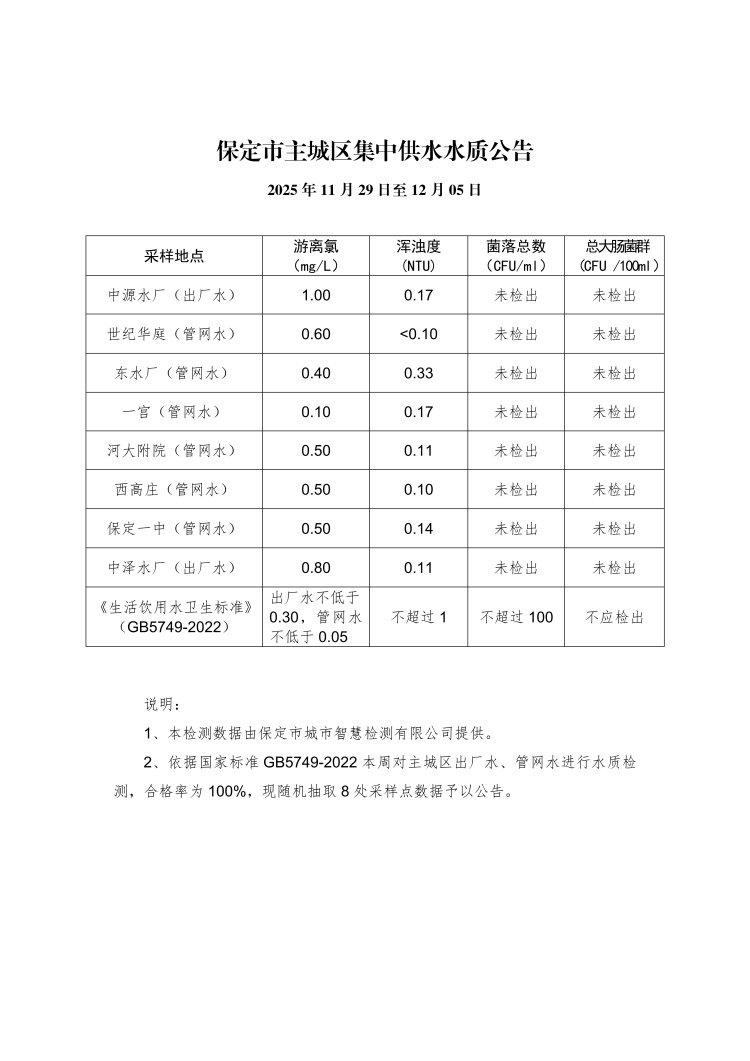 主城區(qū)集中供水水質(zhì)公告(11月29日至12月05日)